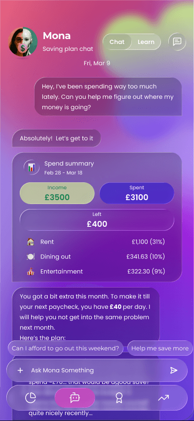 Mona helps you learn about finance each day and proactively stay on track of your plans
