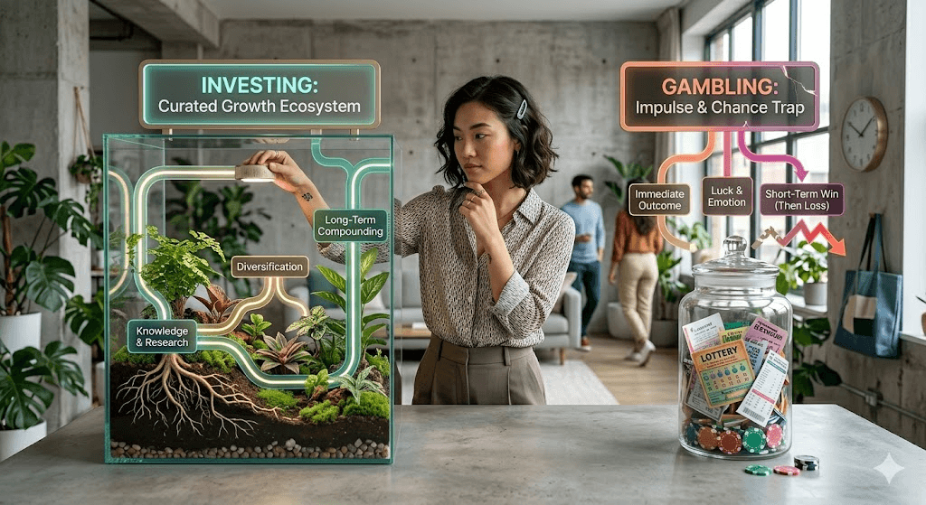 It's a fair question, and it gets asked constantly online. Both involve putting money into something uncertain and hoping for more back. Both can feel exciting. Both can go wrong. So what's the actual difference? The short version: gambling is a zero-sum game where the odds are stacked against you on purpose. Investing is putting money into real businesses, property or economies that tend to grow over time, and sharing in that growth.